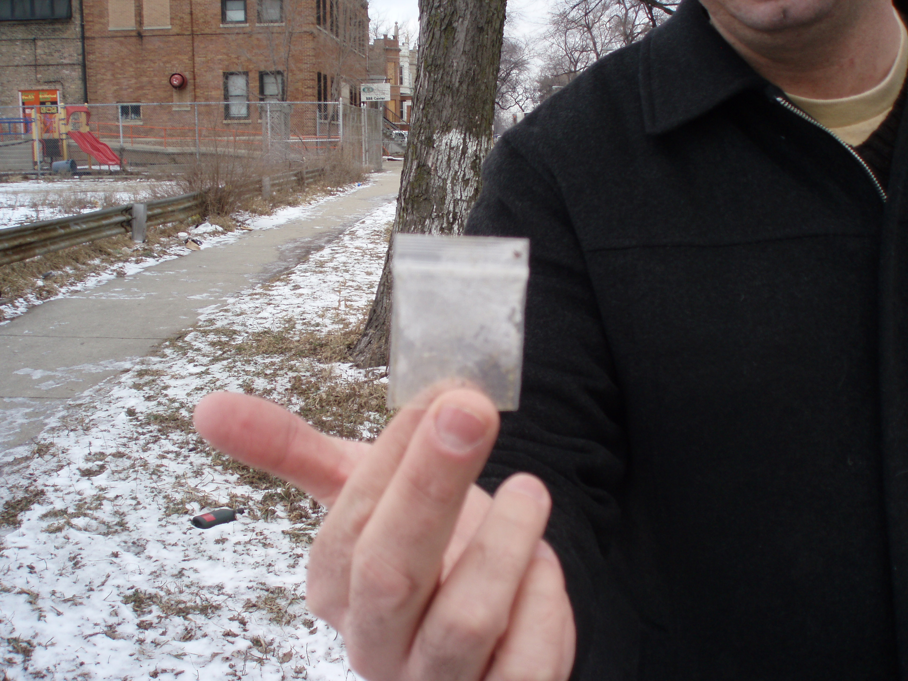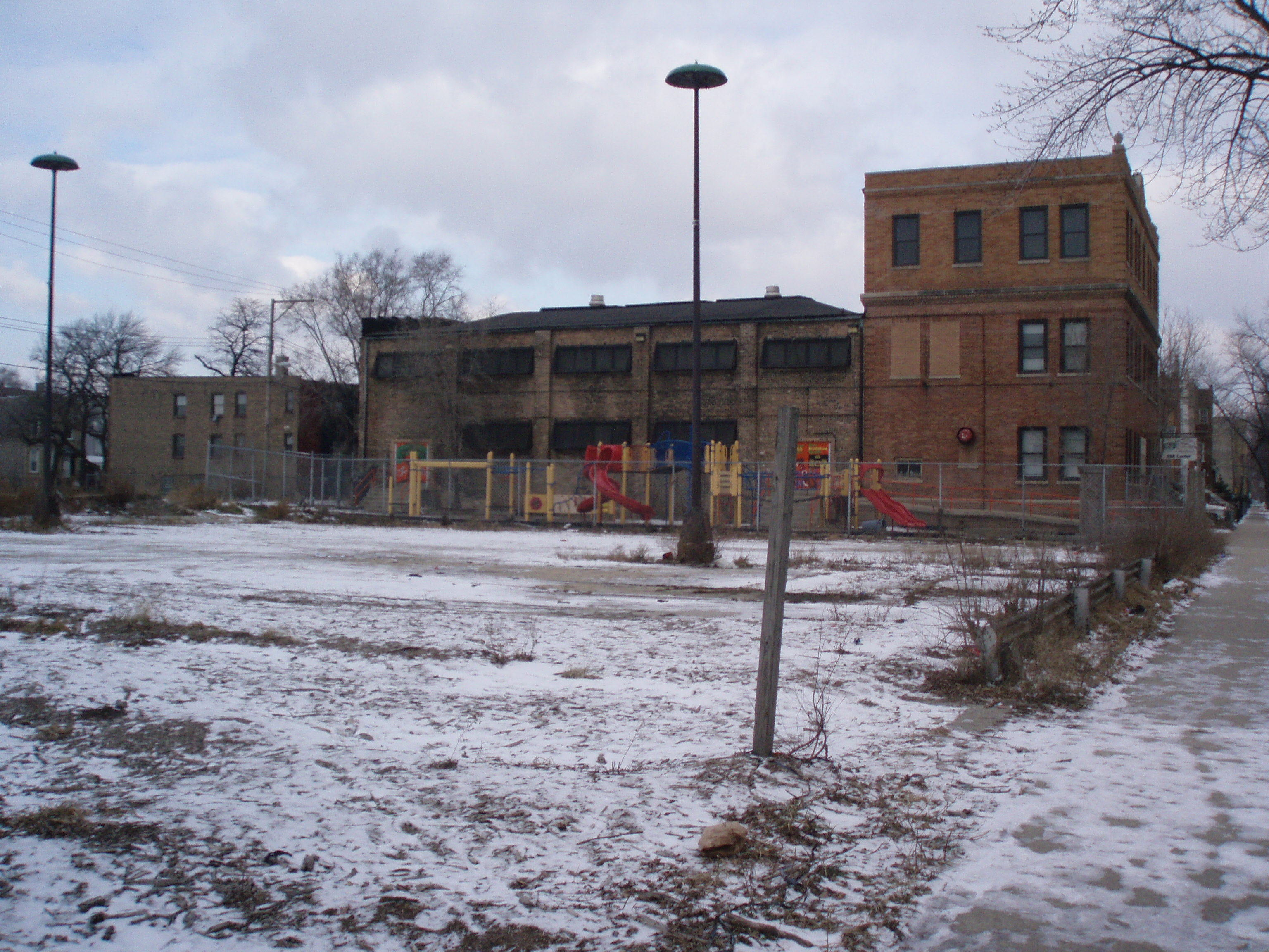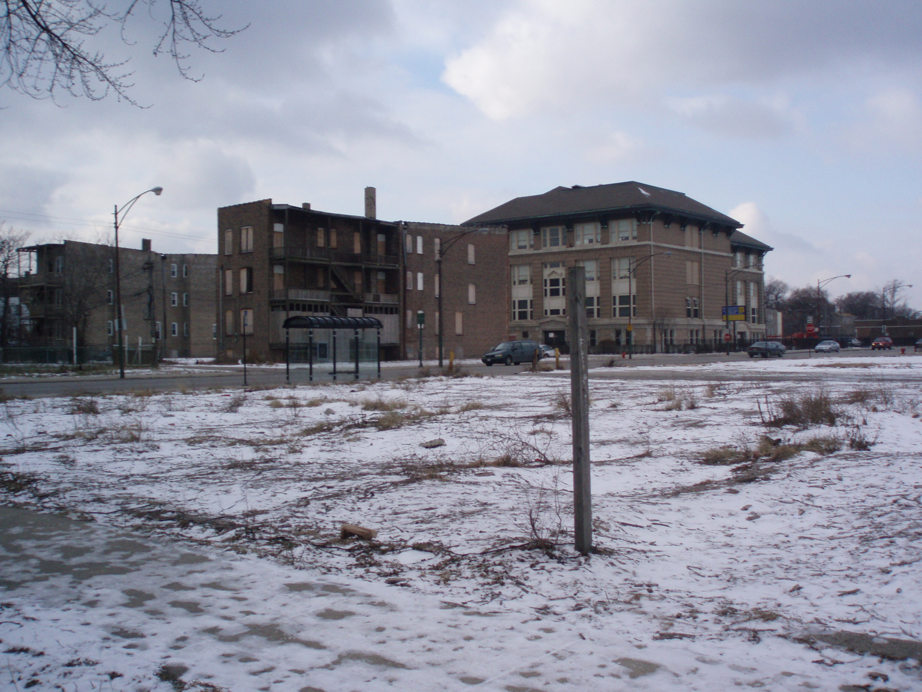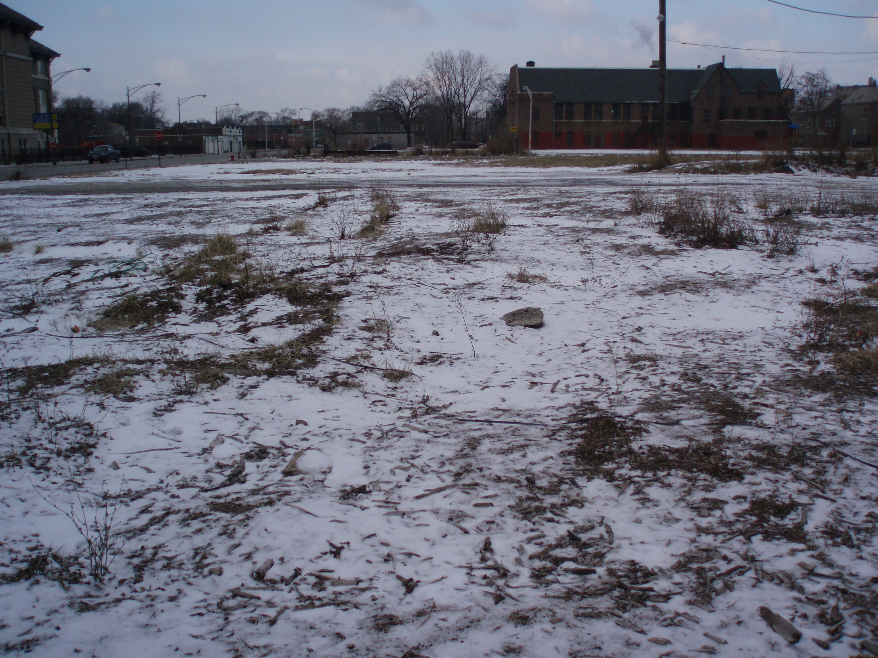 The vacant lot at 1550 N. Ashland at 16th is the site of the apartment building where Dr. Martin Luther King, Jr., lived with his family in Chicago in 1966. This lot has been vacant for at least six years. While photographing the site in January 2007, my friend and I found a little baggie with white residue from crack cocaine. A playground and school can be found next door.